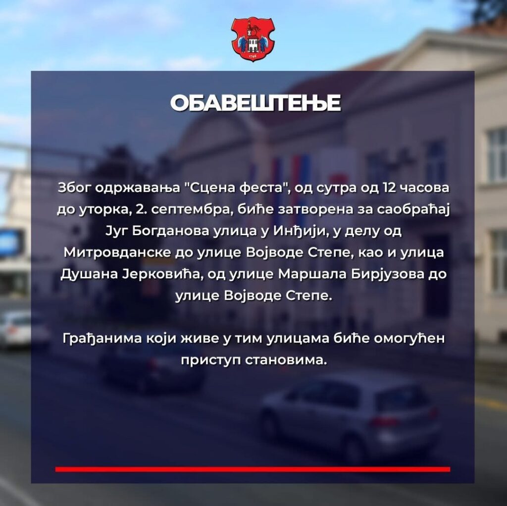 Због одржавања ”Сцена феста”, од сутра од 12 часова до уторка 2. септембра, биће затворена за саобраћај Југ Богданова улица у Инђији, у делу од Митровданске улице до улице Војводе Степе, као и улица Душана Јерковића, од улице Маршала Бирјузова до улице Војводе Степе.